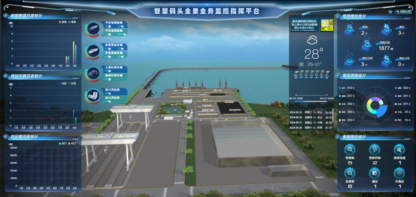 航通智能主要承擔信息化系統(tǒng)包括海關、邊檢、海事信息化系統(tǒng)相應軟硬件設施設備,以及符合海關監(jiān)管要求和前詹作業(yè)區(qū)通用碼頭業(yè)務發(fā)展需要的聯(lián)網(wǎng)監(jiān)管平臺及配套系統(tǒng)。公司對標全國一流碼頭作業(yè)區(qū)口岸基礎設施信息化建設標準,充分運用物聯(lián)網(wǎng)、大數(shù)據(jù)、人工智能、數(shù)字孿生、3D模型等前沿科技,并引入智慧碼頭全景業(yè)務指揮監(jiān)控平臺,通過平臺與碼頭作業(yè)系統(tǒng)對接,抽取碼頭內(nèi)外貿(mào)貨物的作業(yè)數(shù)據(jù),結合可視化智能大數(shù)據(jù)展示功能,實現(xiàn)獲取船舶抵錨、靠泊離港作業(yè)動態(tài),并對內(nèi)外貿(mào)貨物進出卡口、堆場存取、裝卸船等實時、動態(tài)管理和全程監(jiān)控,全面提升碼頭作業(yè)全過程可視化監(jiān)管水平和查驗全流程智能化管理。